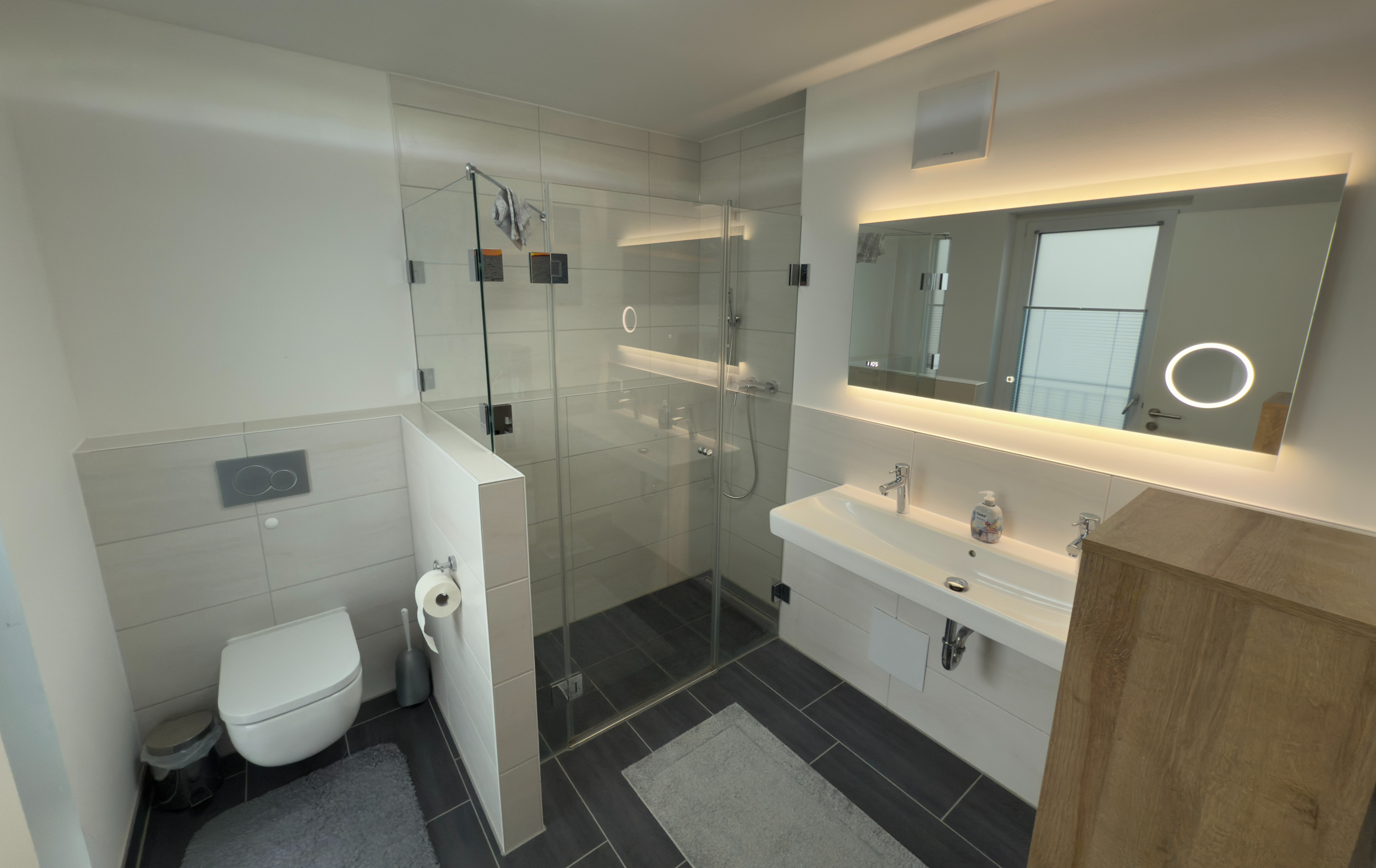 – Hauptbad: mit gestaltet mit weißen Bodenfliesen und weißen Wandfliesen, ausgestattet mit bodenbündiger Dusche, Doppel- Waschbecken und WC.