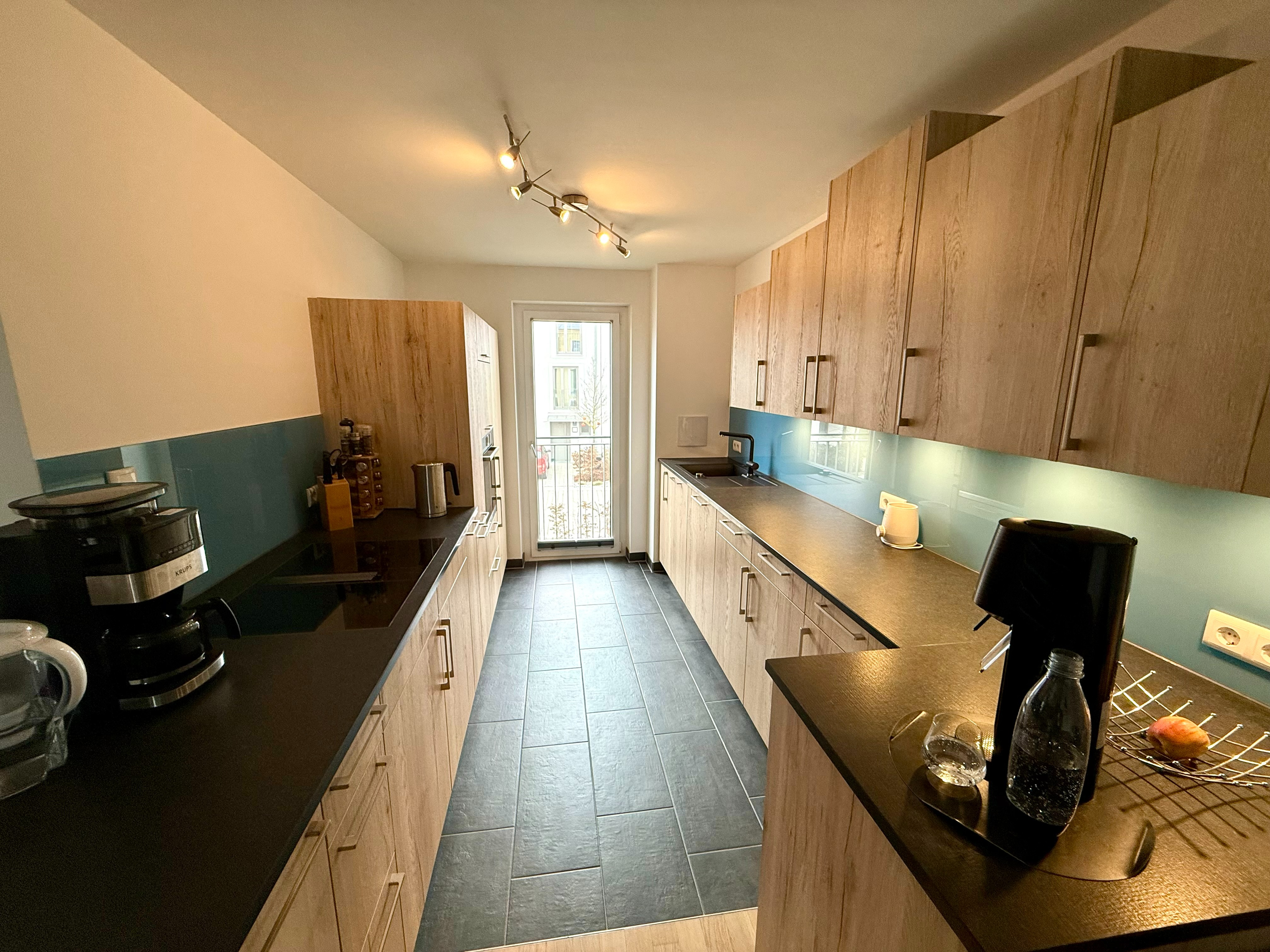 Die exklusiv angefertigte Einbauküche ist mit hochwertigen Elektrogeräten ausgestattet und gehört zur Wohnung. Die großzügige Süd-West- Loggia lädt zum Entspannen im Freien ein.